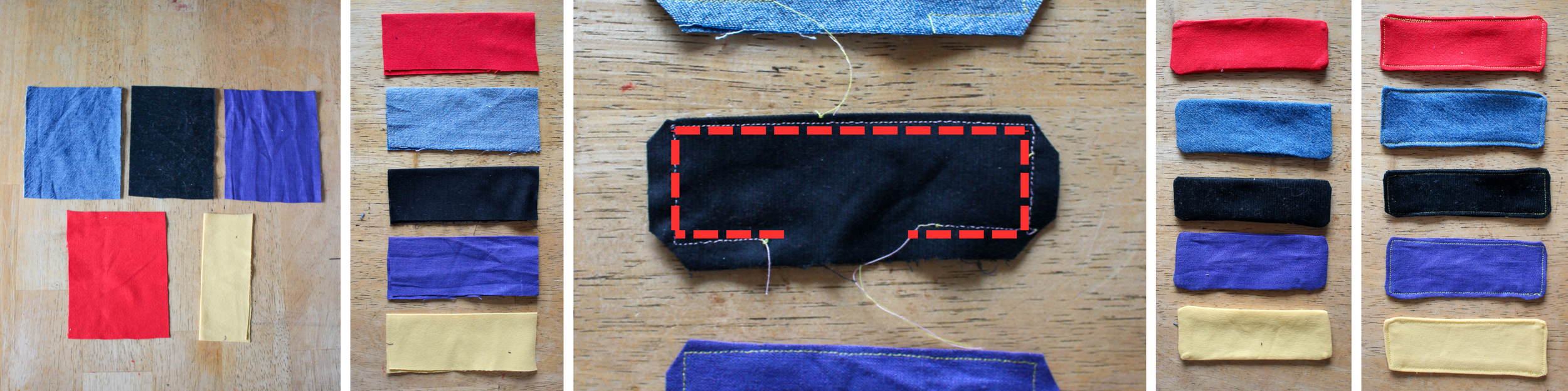 Image: Cut belt loops, fold in half, sew along dotted line, turn inside out, iron flat, sew around entire edge.
