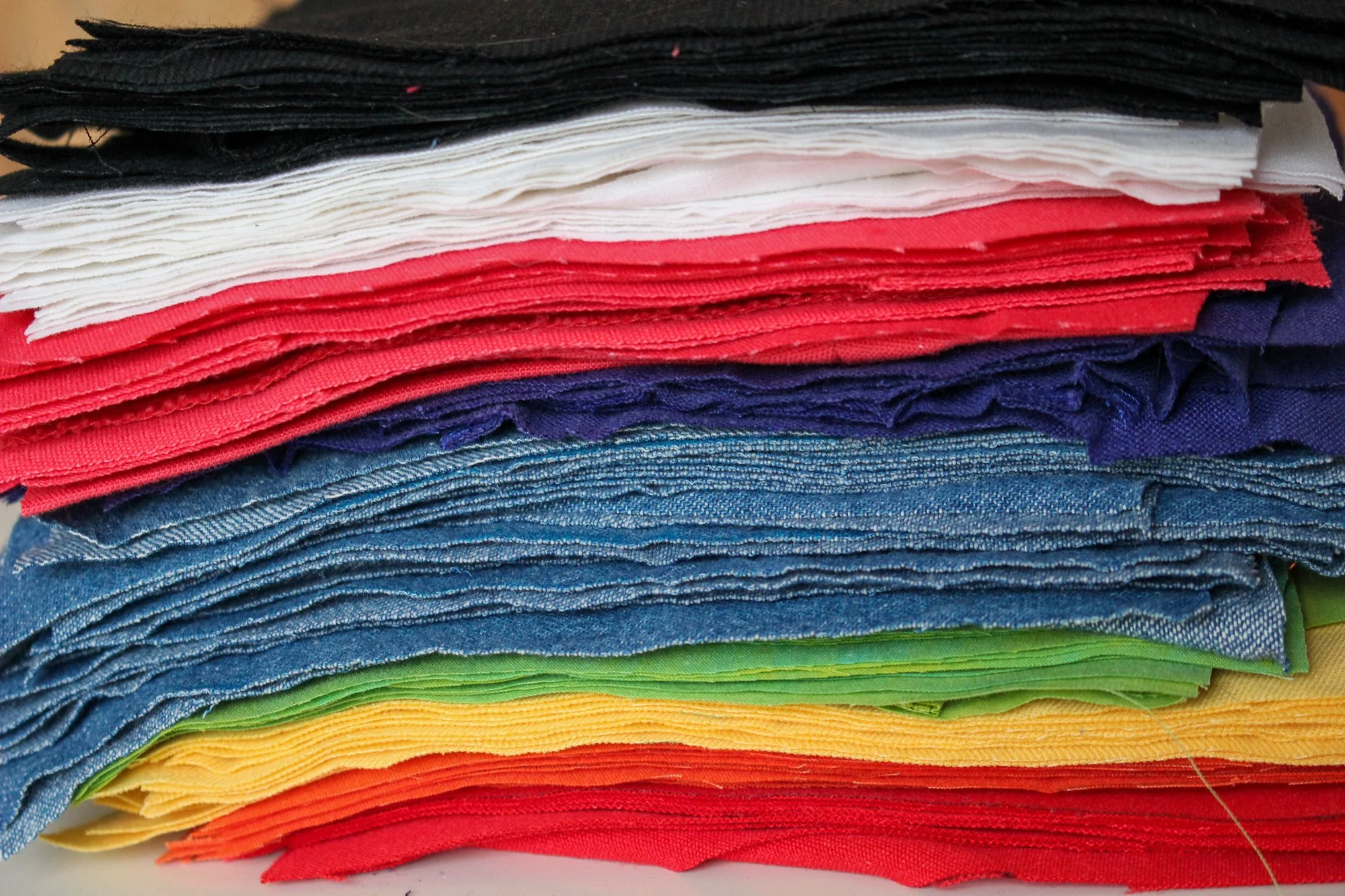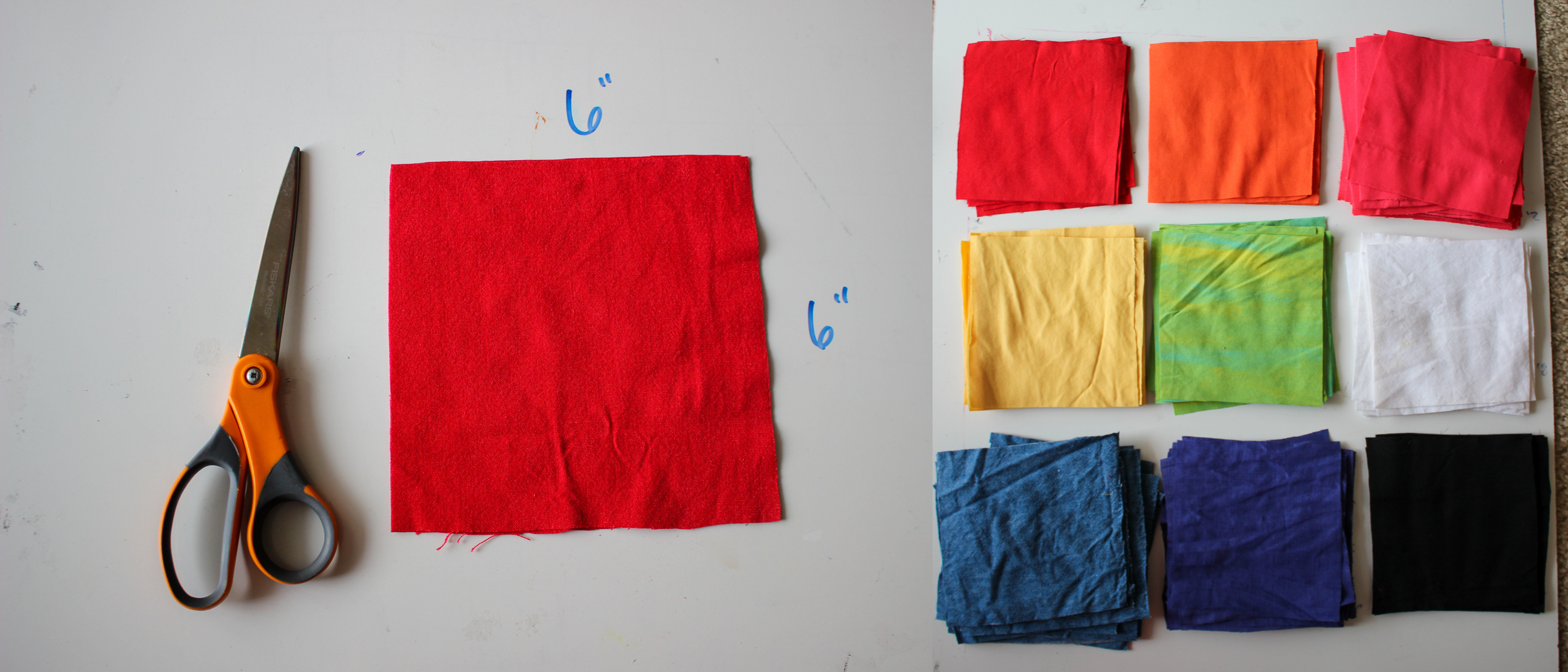 In this tutorial, I used: Tablecloth (Red), Scrub Pants (Orange), Elastic Trousers (Yellow), Comforter Cover (Green), Comforter Cover (Blue), Elastic Trousers (Purple), Micro Cordurouy Fabric Scraps (Black), Tablecloth (White)