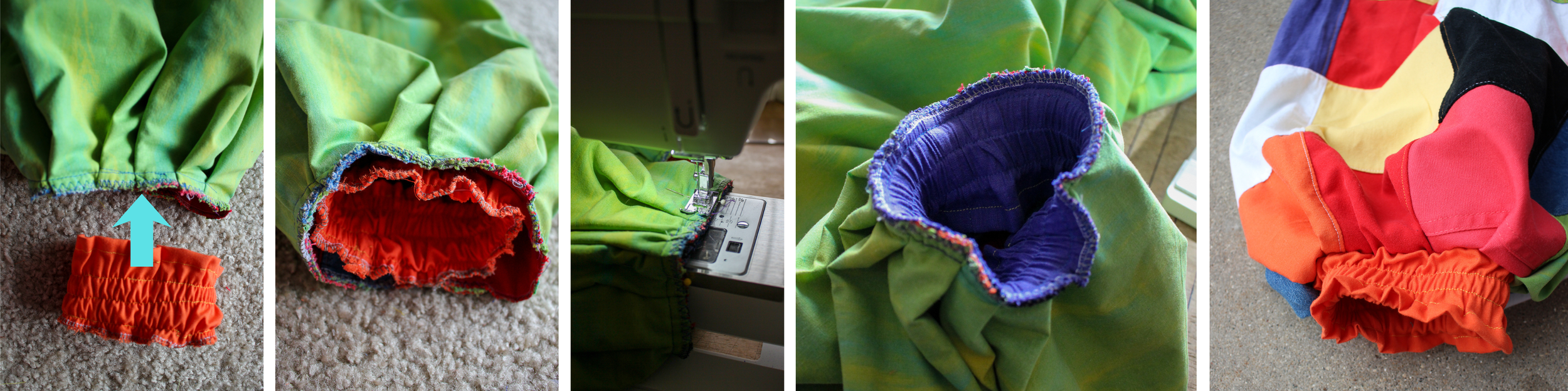 Image: Stretch the elastic to check width, pleat the legs to the same size, turn inside out.
