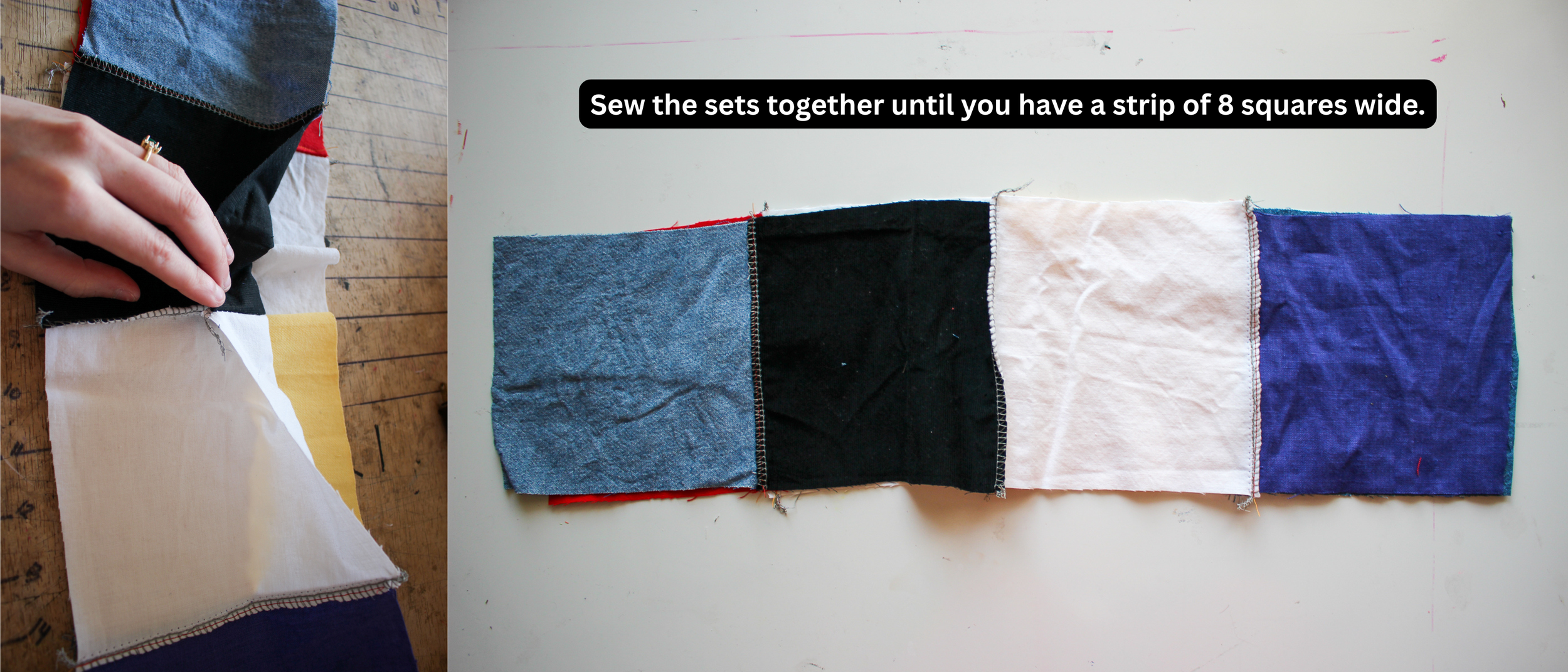 Image: Sew the sets together until you have strips of 8 squares wide.