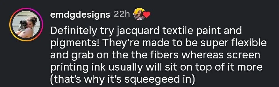 Thank you to everyone who mentioned the use of “Fabric Medium” mixed with acrylic paint, and Jacquard textile paint! As I’ve said, I’m no expert, so I’m always open to more tips and tricks to add here! :)