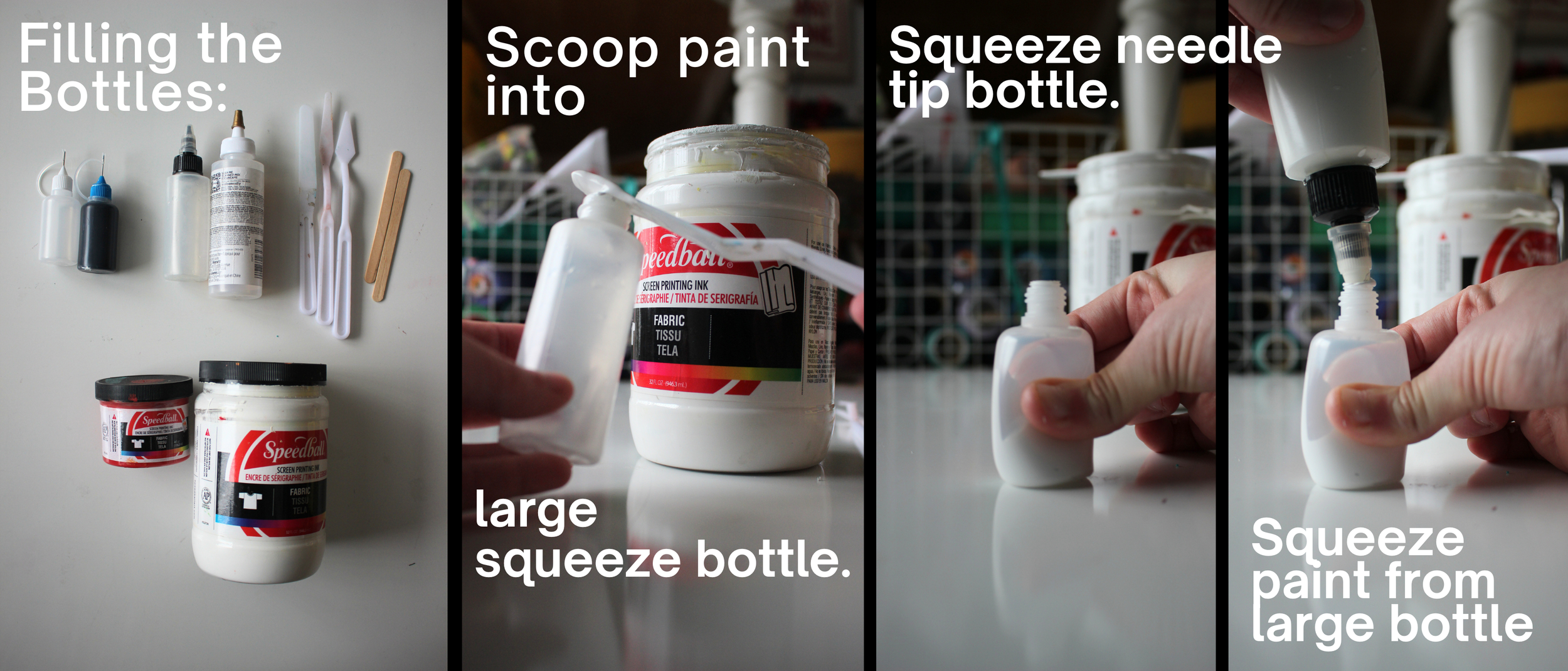 -Squeeze the Needle Tip Bottle first, then insert the large bottle into the opening and squeeze the paint into it. You should feel the small bottle wanting to expand. Allow it to expand naturally, and stop squeezeing the paint in once it’s fully expanded.