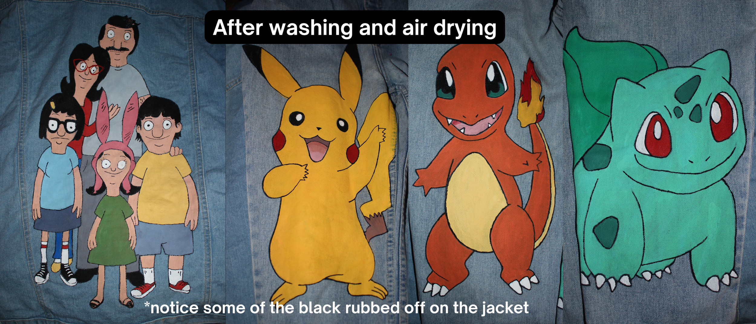I discovered outlining while the other paint is still wet creates a better hold. (This jacket was outlined after the base was completely dry, versus the pokemon that were outlined while wet. You’ll see some of the black came off this jacket in the wash below. )